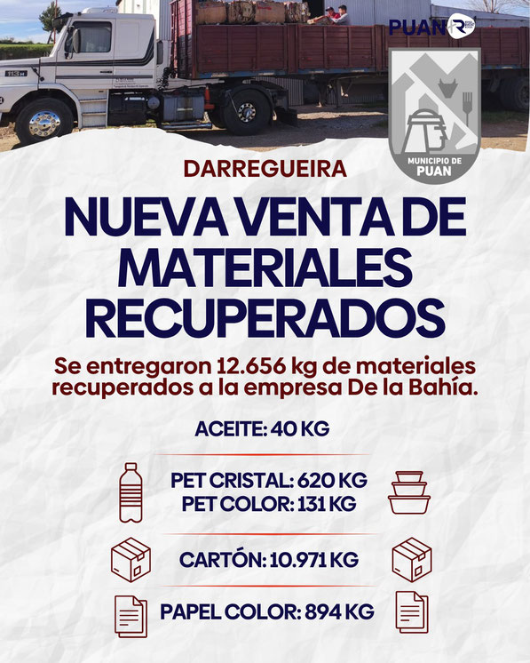 El pasado 22 de septiembre, se realizó una nueva entrega a la empresa De la Bahía, correspondiente a materiales para reutilizar clasificados en la Planta de Darregueira.