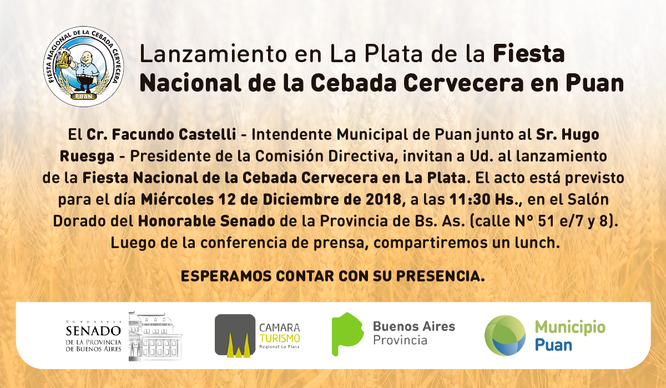 El evento tendrá lugar en el Honorable Senado de la Provincia de Buenos Aires, con la presencia del Intendente de Puan, Facundo Castelli, el Senador Provincial Cdor. Horacio Luis López, el Presidente de la Cámara de Turismo de La Plata, Daniel Loyola y el Presidente de la Comisión Permanente de la Fiesta de la Cebada Cervecera, Hugo Ruesga.