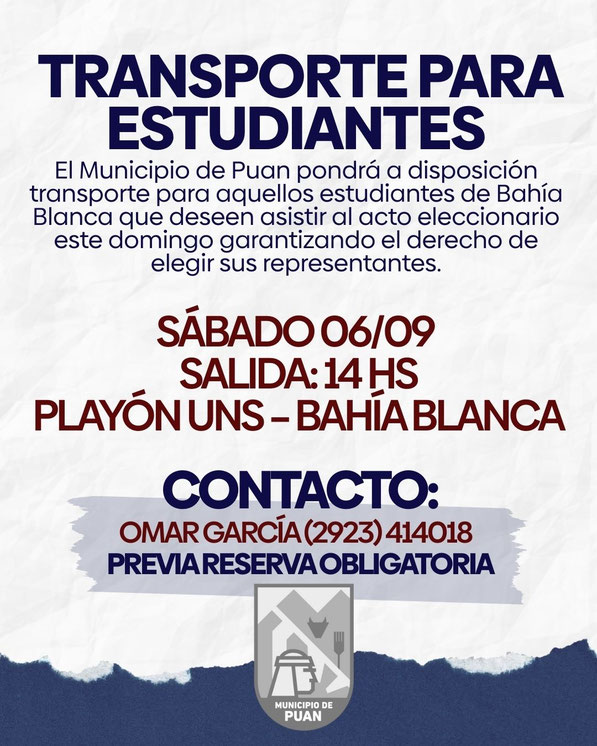 El Municipio de Puan pondrá a disposición transporte para aquellos estudiantes de Bahía Blanca que deseen asistir al acto eleccionario este domingo, garantizando el derecho de elegir sus representantes.