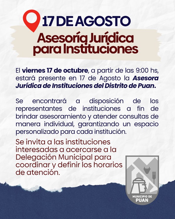 Se informa a las instituciones de la localidad de 17 de Agosto que este viernes 17 de octubre, a partir de las 9:00 horas, estará presente en la localidad la Asesora