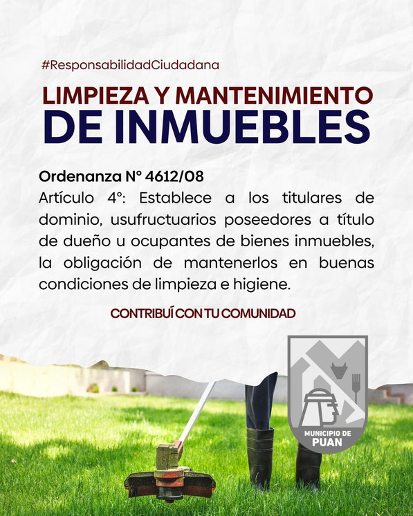 El Municipio de Puan, a través del área de Bromatología e Inspección, recuerda a los vecinos la vigencia de la Ordenanza N° 4612/08, la cual establece la obligación de