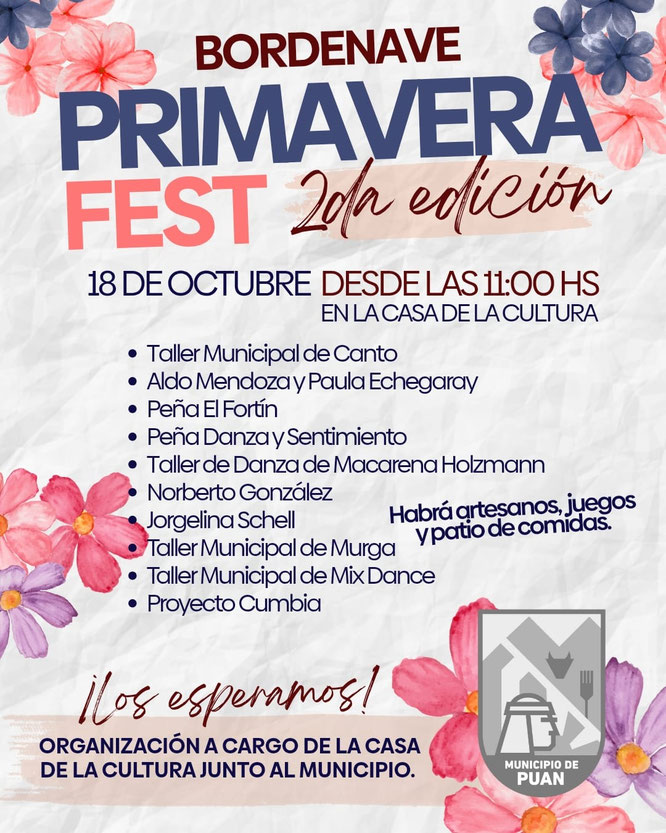 Este sábado, Bordenave vivirá la segunda edición de Primavera Fest, un evento que tendrá lugar en la Casa de la Cultura y es organizado en conjunto por la institución y el Municipio de Puan.