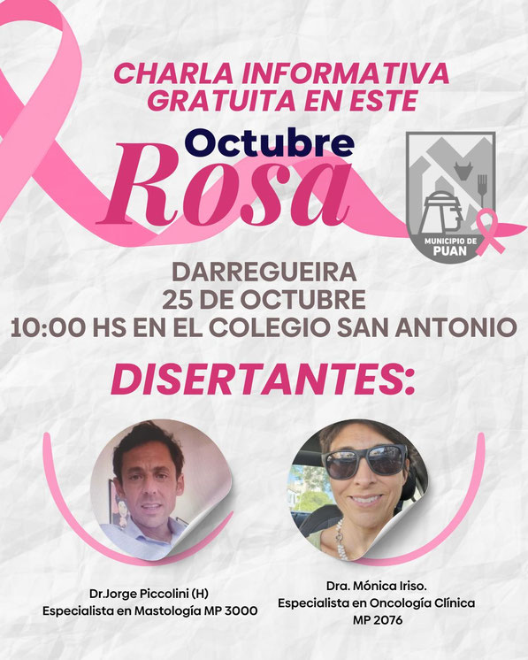 La actividad se realizará el día de mañana, sábado 25 de octubre a las 10:00 horas en el Colegio San Antonio de la localidad de Darregueira y contará con la disertación del Dr. Jorge Piccolini (H), especialista en Mastología (MP 3000), y de la Dra. Mónica Iriso, especialista en Oncología Clínica (MP 2076).
