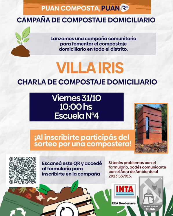 ¡Inscribite escaneando el código QR que figura en el flyer y participá del sorteo de una compostera! Por consultas comunicarse al 2923 537915.